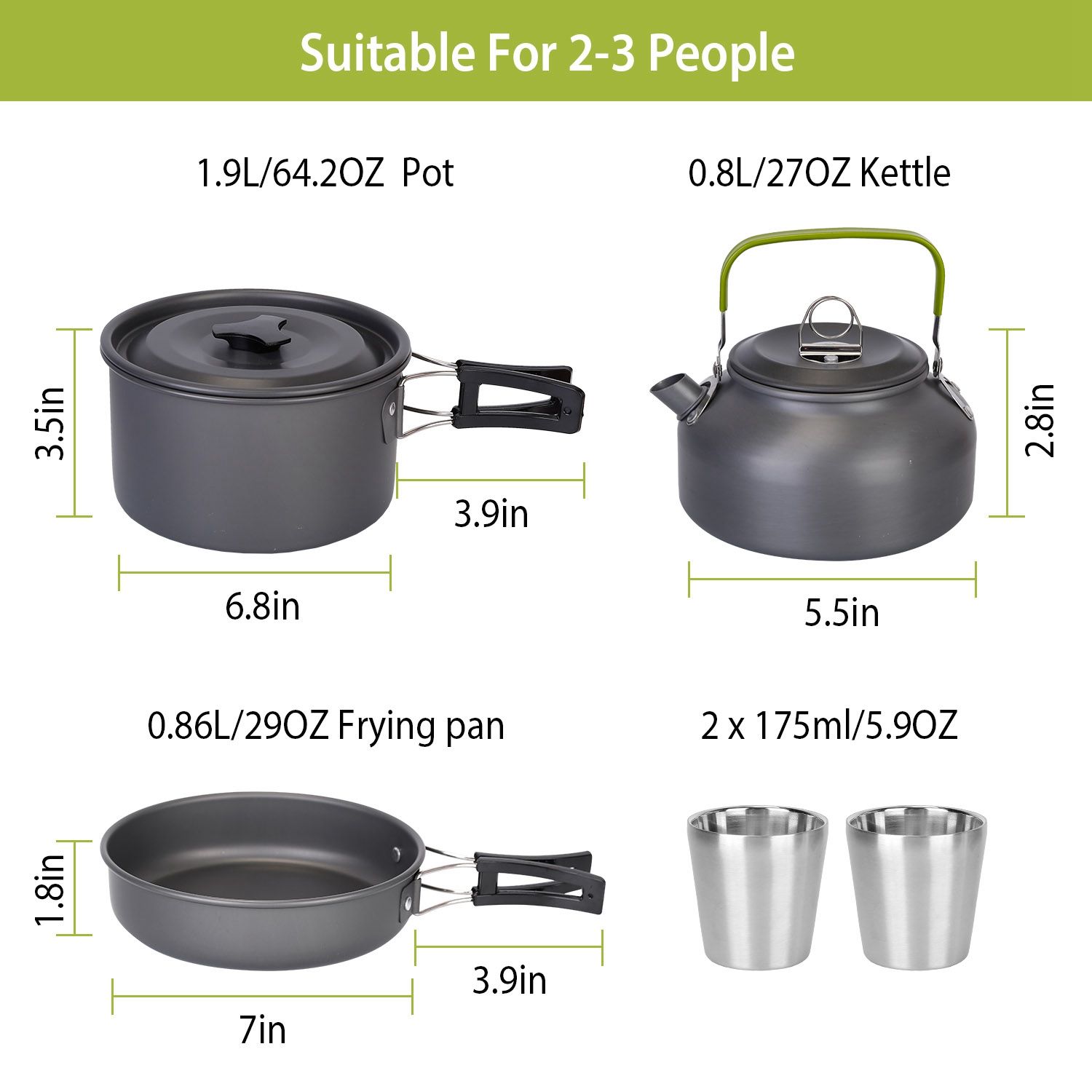 *12Pcs Outdoor Cooking Set*:This package contains one pot(1.9L); one kettle with lid(0.8L); one frying pan(0.86L); one pot lid; one carabiner; one spoon; one fork; one knife; two cups(175ml); and two storage bags. You can find everything you need for outdoor cooking in this package.