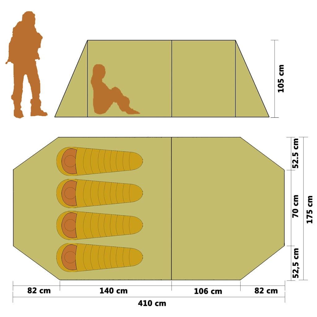 It has a comfortable interior suitable for camping outdoors, travelling and for on vacation at a campsite. This tent is large enough to accommodate up to 4 people.