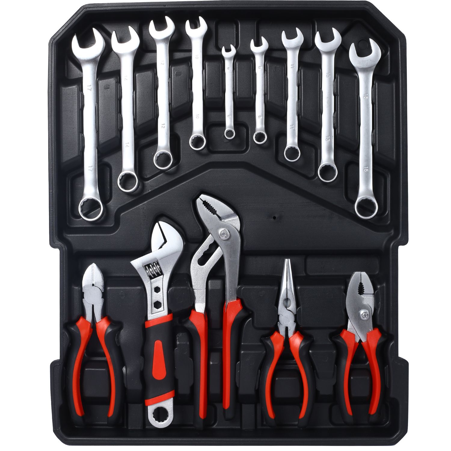 Tool Set Specifications:Tray A: 1PCS-6"LONG NOSE PLIER 1PCS-6"DIAGONAL PLIER 1PCS-6"SLIP JOINT PLIER 1PCS-9" WATER PUMP PLIER 1PCS-8" ADJUSTABLE WRENCH 9PCS-COMBINBATION WRENCH : 6-8-10-11-12-13-14-15-17MMTray B:11PCS-COMFORTALIE SCREWDRIVER: PH2*100,6*100 ,PH3*150PH2*38,6*38,PH1*75,5*75,PH1*100,4*100,PH0*75,3*753PCS-INSULATION SCREWDRIVER: PH1*100,4*100, 5.5*125 1PCS-ALUMINUM RATCHET SCREWDRIVER 1PCS-TEST PENCIL:100V-250V 1PCS-TIRE GAUGE 24PCS-25MM CRV BITS1PCS-58MM BITS HOLDER 9PCS-HEX KEYS: 1.5-2-2.5-3-4-5-6-8-10MM 6PCS-PRECISION SCREWDRIVER IN PLASTIC BOXTray C:1PCS-8" WIRE STRIPPING PLIERS 1PCS-ELECTRIC GLUE GUN 2PCS-GLUE STICK 1PCS-INSULATION TAPE 1PCS-8" KITCHEN SCISSORS 1PCS-UTILITY KNIFE 18MM 1PCS-CLAW HAMMER 1PCS-10" ALUMINUM LEVEL 2PCS-NYLON CLIP 3" 312PCS-SMALL HARDWARE TOOLS IN PLASTIC BOX 1PCS-MEASURING TAPE 5MTray D:14PCS-1/2" SOCKETS:8-9-10-11-12-13-14-15-16-17-18-19-20-30MM15PCS-1/4" SOCKETS: 4-4.5-5-5.5-6-6.5-7-7.5-8-9-10-11-12-13-14MM 1PCS-FLEXIBLE PIPE2PCS-SLIPING BAR 1/4"&1/2"2PCS-UNIVERSAL JOINT 1/4"&1/2"2PCS-1/4"EXTENSION BAR 2"&4"1PCS-1/2"EXTENSION BAR 5"2PCS-1/2"SPARK PLUG SOCKETS 16MM&21MM1PCS-SPINNER HANDLE2PCS-RATCHET HANDLE 1/4"&1/2"530PCS-TIES 2.5*100MM1 PAIRS OF WHITE GLOVES