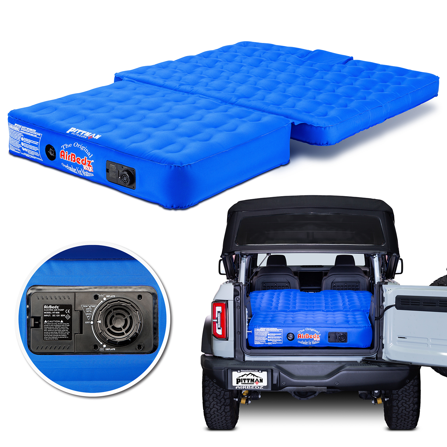 Our NEW Ford Bronco only AirBedz Air Mattress by Pittman Outdoors is designed to transform your 4 door Bronco into the ultimate camping companion. Our patent-pending offset design ensures a level sleeping area in the back of your vehicle, providing unparalleled comfort. Featuring a built-in air pump with a detachable, rechargeable battery, inflation and deflation is a breeze. The extra-long design, measuring 6′ 5″ and the included floor fillers make it perfect for taller individuals. Crafted from heavy-duty, RF welded, premium oxford fabric, this mattress is both durable and easy to clean, resisting punctures for long-lasting use. It comes with a built-in, rechargeable battery air pump, USB-C charger cord and oversized carry bag, offering convenience and portability. Comfortably sleeping two people, the AirBedz Air Mattress inflates and deflates quickly, ensuring a restful night’s sleep in your Bronco is always just an inflate away.