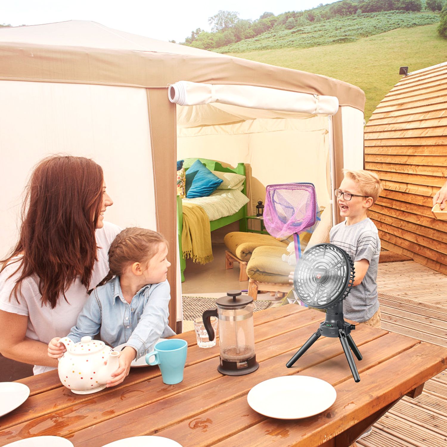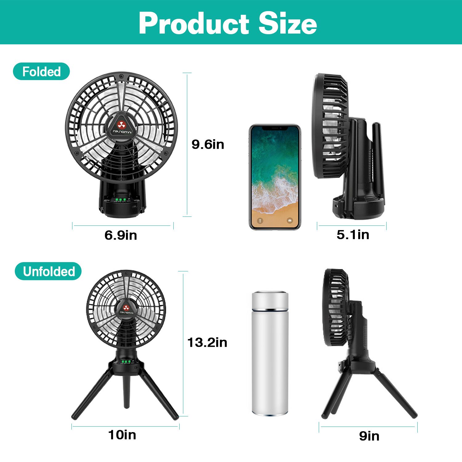 *3 Mounting Styles*:Equipped with 1 foldable tripod and 1 hanging hook on the bottom, our camping fan can be hung in the tent, put on the flat ground or table. A perfect companion for home and travel when summer is coming. Suitable for camping, fishing, backpacking, hiking and other outdoor activities.