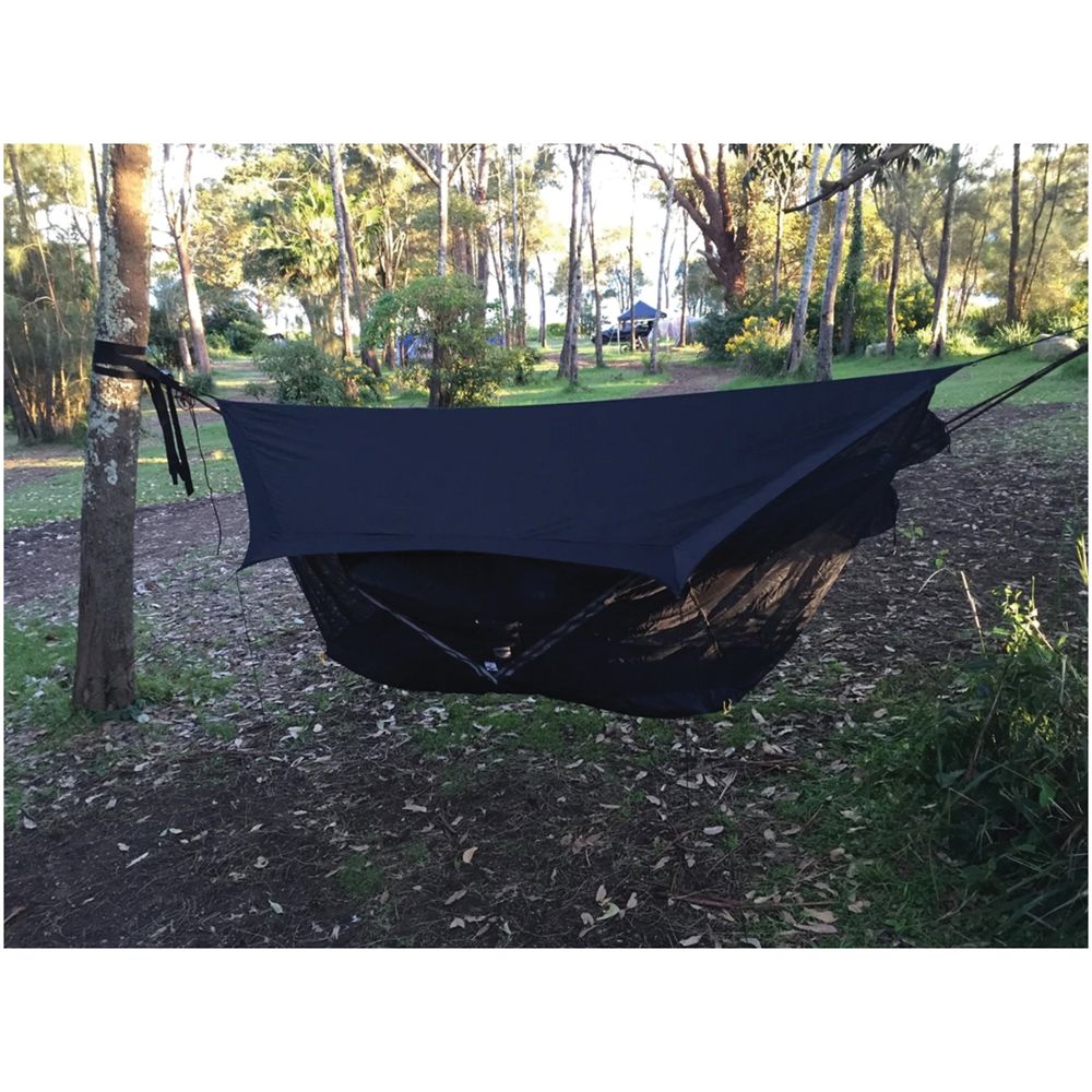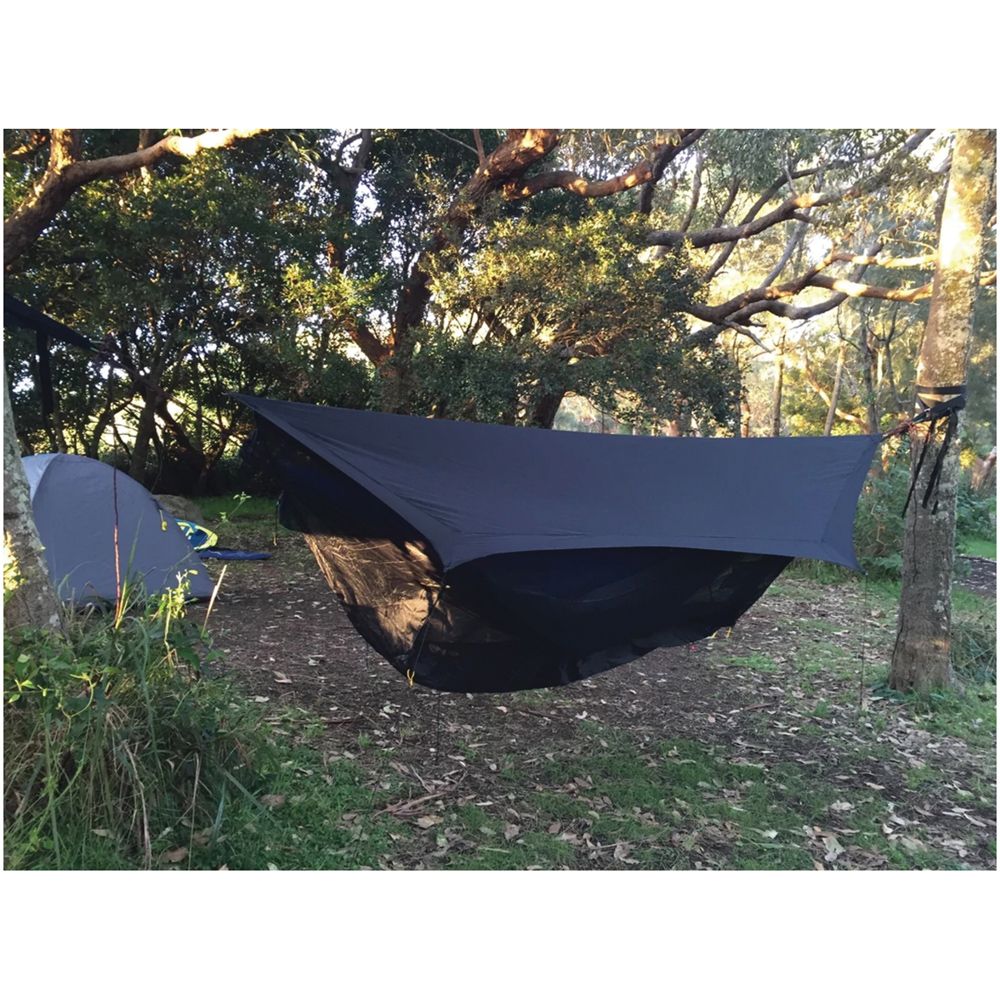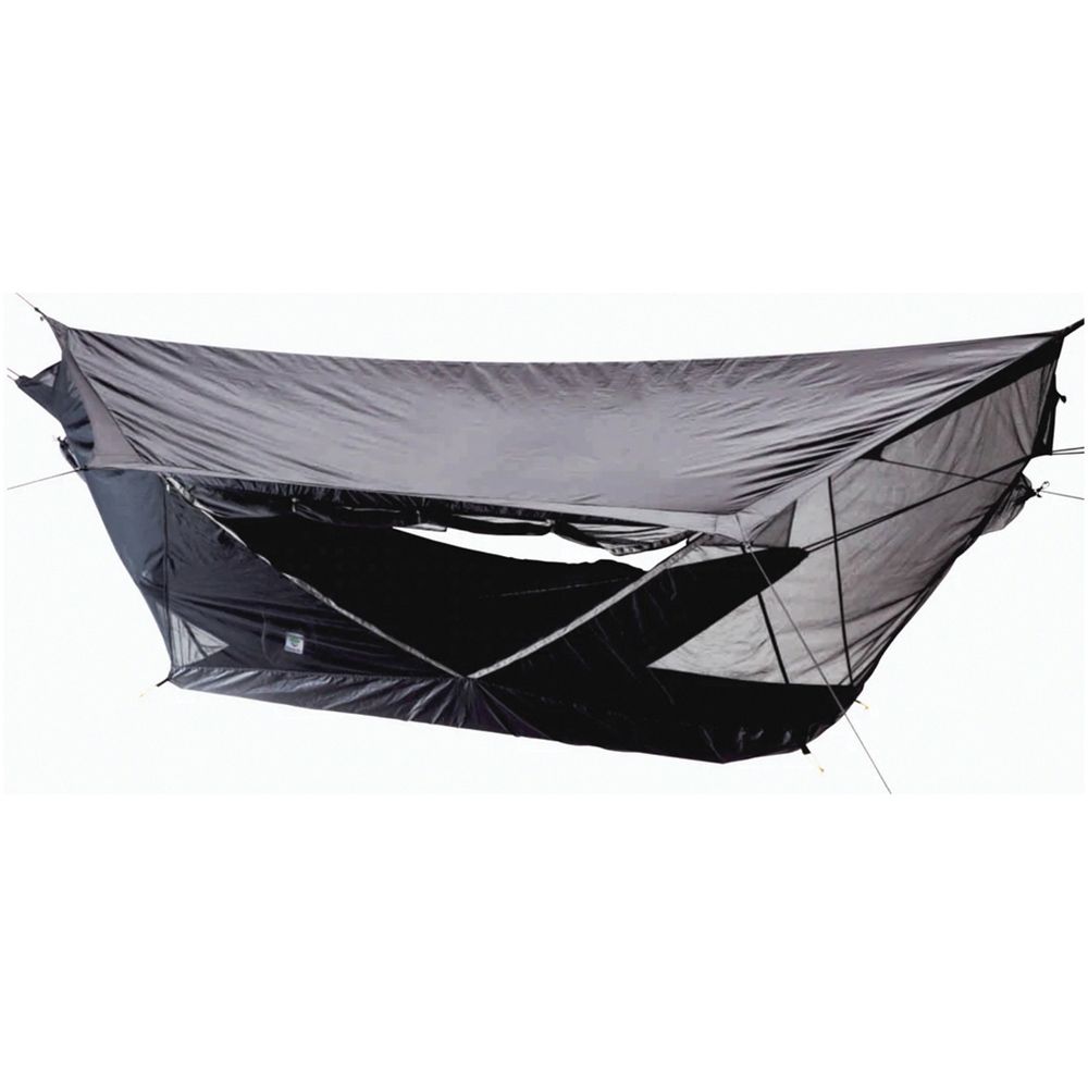 Sky Tent 2 is a revolution in the making, bringing hammock camping to a new level of comfort and convenience. Sky Tent allows you to stay dry from the rain, safe from the bugs and provides ample space for you and your gear. Sky Tent 2 now accommodates 2 hammocks (not included) so both you and a friend can hang together. An oversized rain fly provides complete protection from the rain while 2100 holes psi no-see-um netting keeps out the smallest bugs. Sky Tent 2 features a new ripstop nylon base layer that helps retain body heat and creates a tough floor for using Sky Tent on the ground. A new prusik knot allows the ridgeline of Sky Tent 2 to be adjustable. The oversized attached waterproof stuff sack easily accommodates any sized hammock. There is plenty of room to hang your backpack from your hammock ropes so both you and your gear can stay off the ground and dry.
