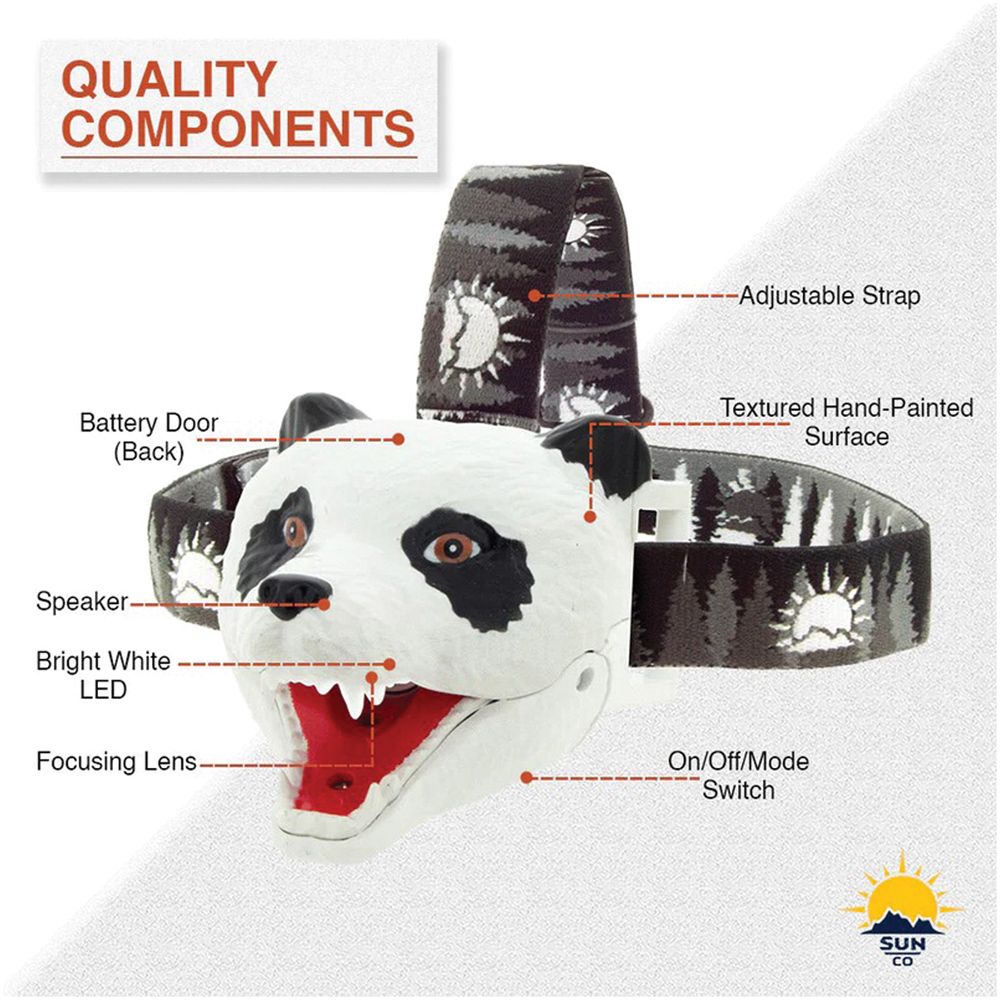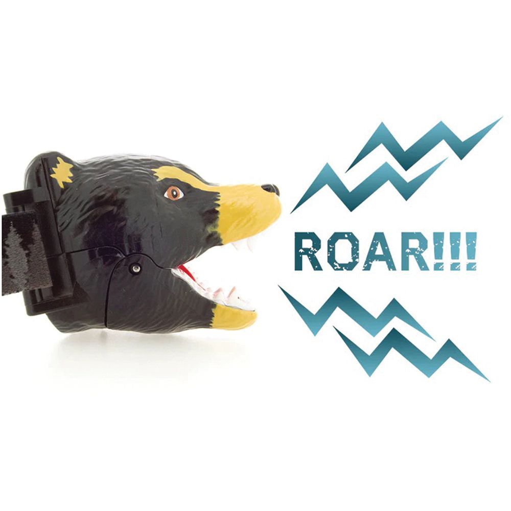 The light with the bite! The perfect accessory for wilderness-loving boys, girls, or adults! The Sun Company Bear Headlamp roars and the light is turned on when the mouth is closed. Close mouth again to turn off. Includes mode for only light and no sound! Adjustable elastic straps. Super bright white LED powered by 3 replaceable AAA batteries (included). LED protected by focusing lens. Ages 6 and up. Perfect for reading, camping, safety. 2.8" W x 2.7"H x 2.9"D. Weight: 4.2 oz.