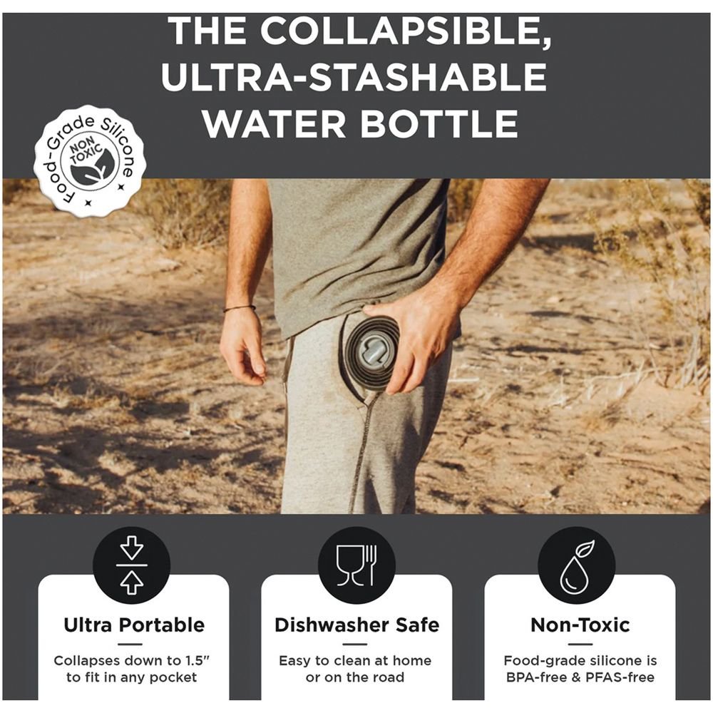 Stay hydrated anywhere with this collapsible, ultra-stashable silicone water bottle—a planet-friendly solution designed for life on the go. When empty, it collapses to a slim 1.5-inch profile, making it easy to store in pockets, packs, carry-ons, or glove boxes.