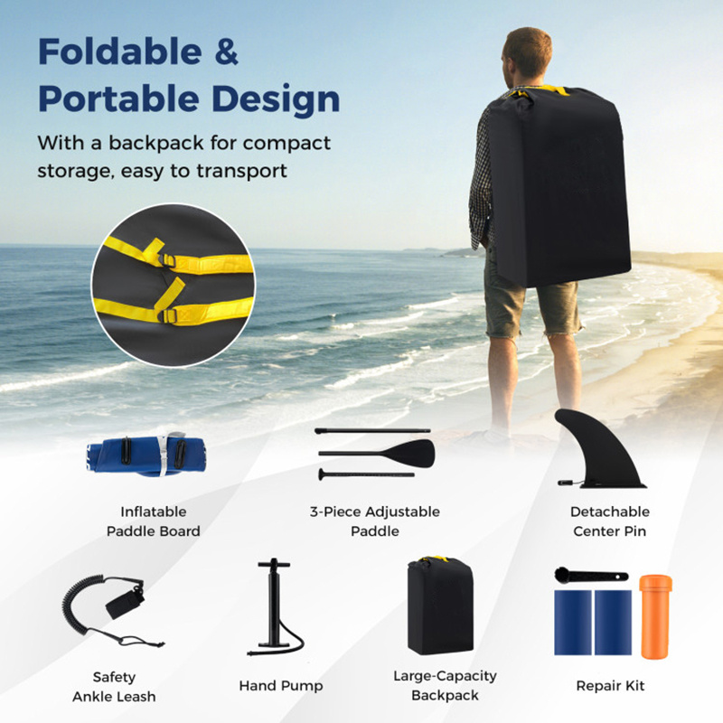 5.Portable Design and Complete Accessories: The inflatable paddle board is easy to deflate and fold into a compact size, then you can store it in the included backpack, making transportation a breeze. Other than that, the package includes a 3-piece adjustable paddle, detachable center fin, safety ankle leash, hand pump, and repair kit, ensuring you have everything you need for your paddling adventure.