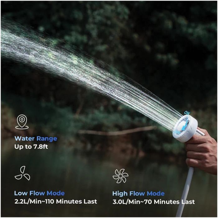 • 【Dual Shower Modes】: Our camping shower simplifies adjustments to a single-handed switch between Low and High flow settings. Low flow conserves water at 0.58 gallons/min for up to 110 minutes, while High flow increases to 0.79 gallons/min for 70 minutes. Each mode balances water efficiency with reach, extending 5.9 feet on Low and 7.9 feet on High, to cater to all your outdoor showering needs