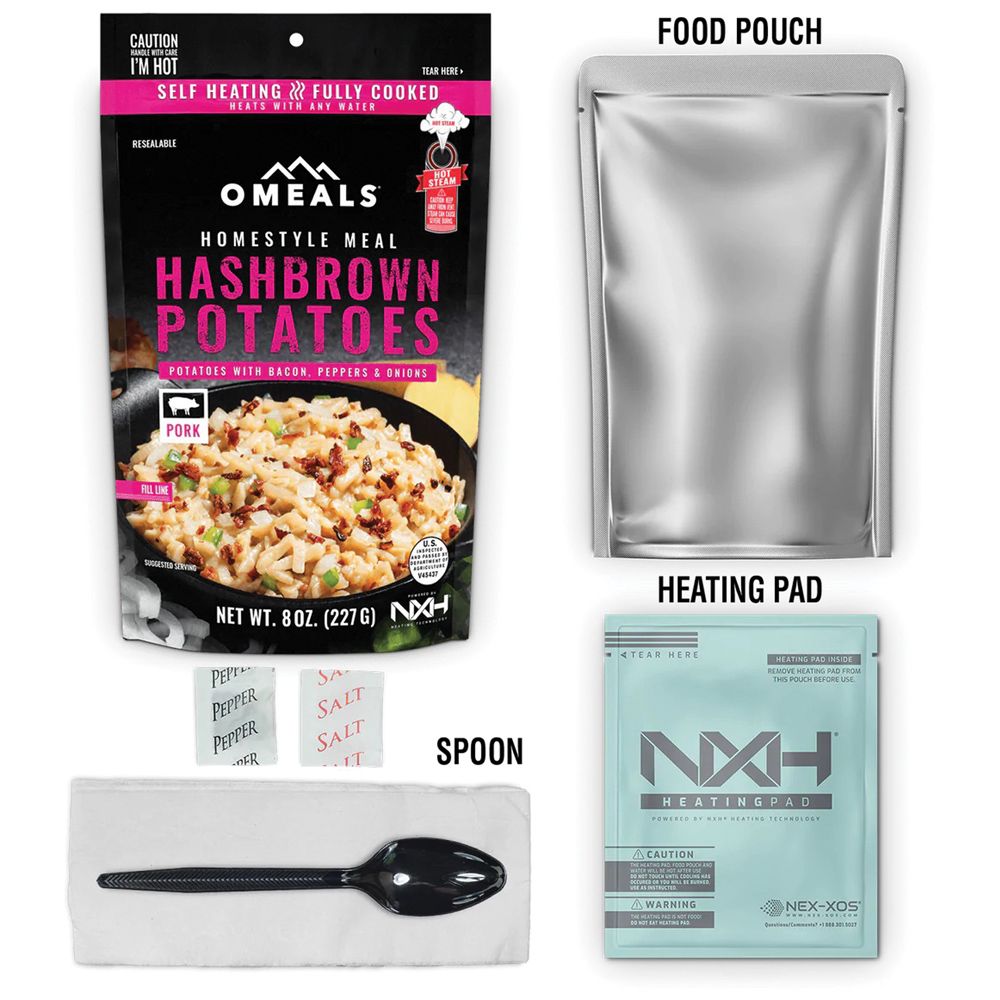 Omeals Homestyle Breakfasts are fully cooked meals that are never freeze dried. They are shelf stable, self-heating and can be eaten anytime anywhere. Each meal comes with everything you need, from food pouch, heating element to utensils. Low cholesterol, good source of fiber. 0 trans fat. 8 oz.