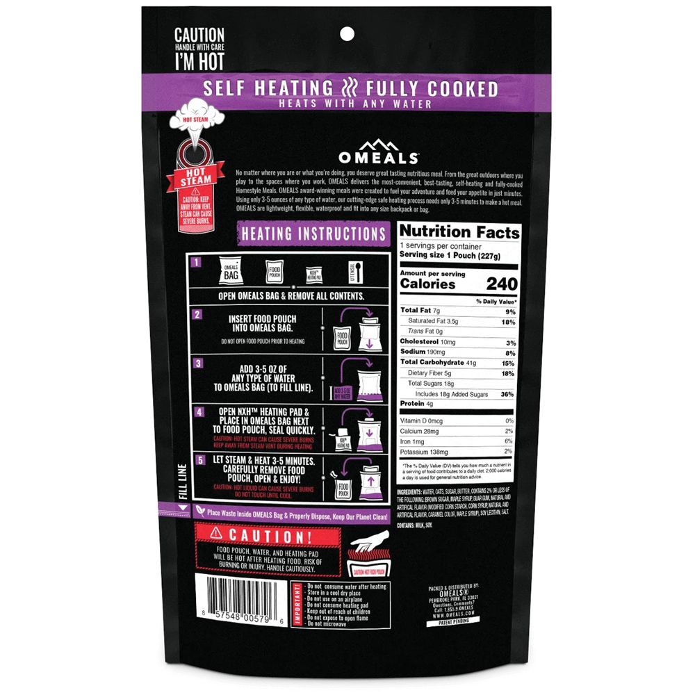 Omeals Homestyle Breakfasts are fully cooked meals that are never freeze dried. They are shelf stable, self-heating and can be eaten anytime anywhere. Each meal comes with everything you need, from food pouch, heating element to utensils. Low cholesterol, good source of fiber. 0 trans fat. 8 oz.