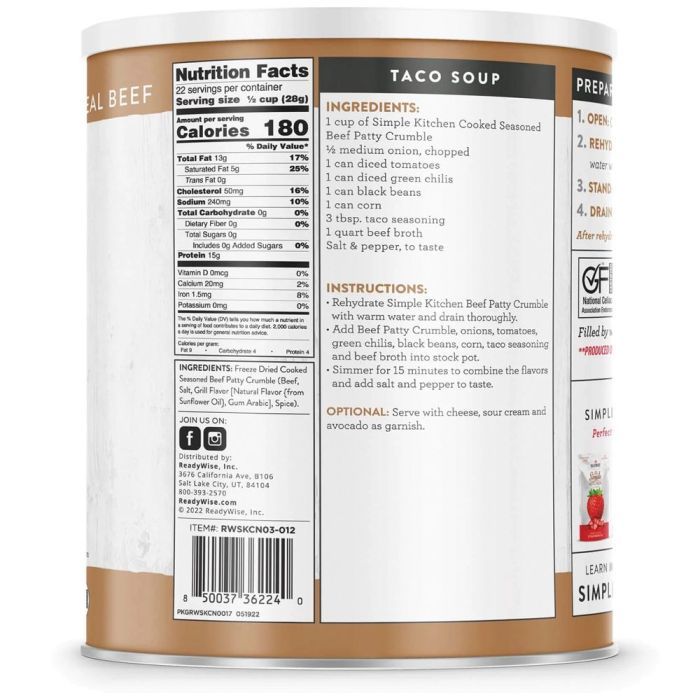 READYWISE SIMPLE KITCHEN FD SEASONED BEEF PATTY CRUMBLES - 22 SERVING CAN READYWISE SIMPLE KITCHEN FD SEASONED BEEF PATTY CRUMBLES - 22 SERVING CAN