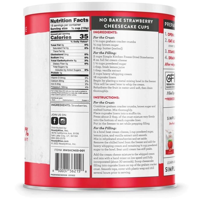This #10 Can contains 18 servings of Readywise's delicious freeze-dried strawberries.