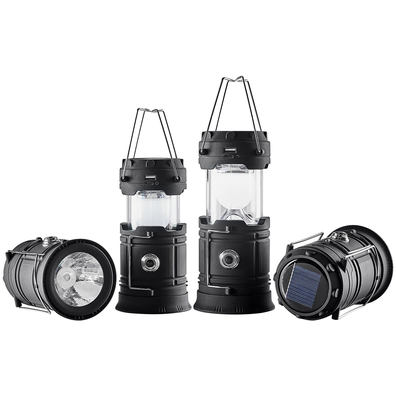 This portable LED camping lantern set delivers dependable lighting wherever you need it. Featuring a collapsible design with adjustable height and 360° illumination, each lantern provides powerful brightness while remaining compact and easy to carry. The built-in rechargeable battery offers extended runtime and can function as a backup power source in emergencies. With dual charging options, hands-free hanging capability, and durable weather-resistant construction, these lanterns are perfect for camping, hiking, emergency preparedness, and home use during power outages.