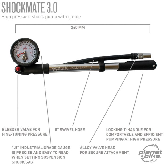 Our Shockmate 3.0 high pressure bicycle suspension pump is designed to efficiently and accurately maintain your bike’s suspension to ensure that your shocks are neither too stiff nor too soft.