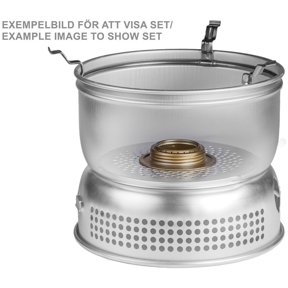 Stove kit with two 1 L saucepans, graduated and un-graduated, 1 non-stick frypan (7.25"), and one aluminum 0.6 L kettle.