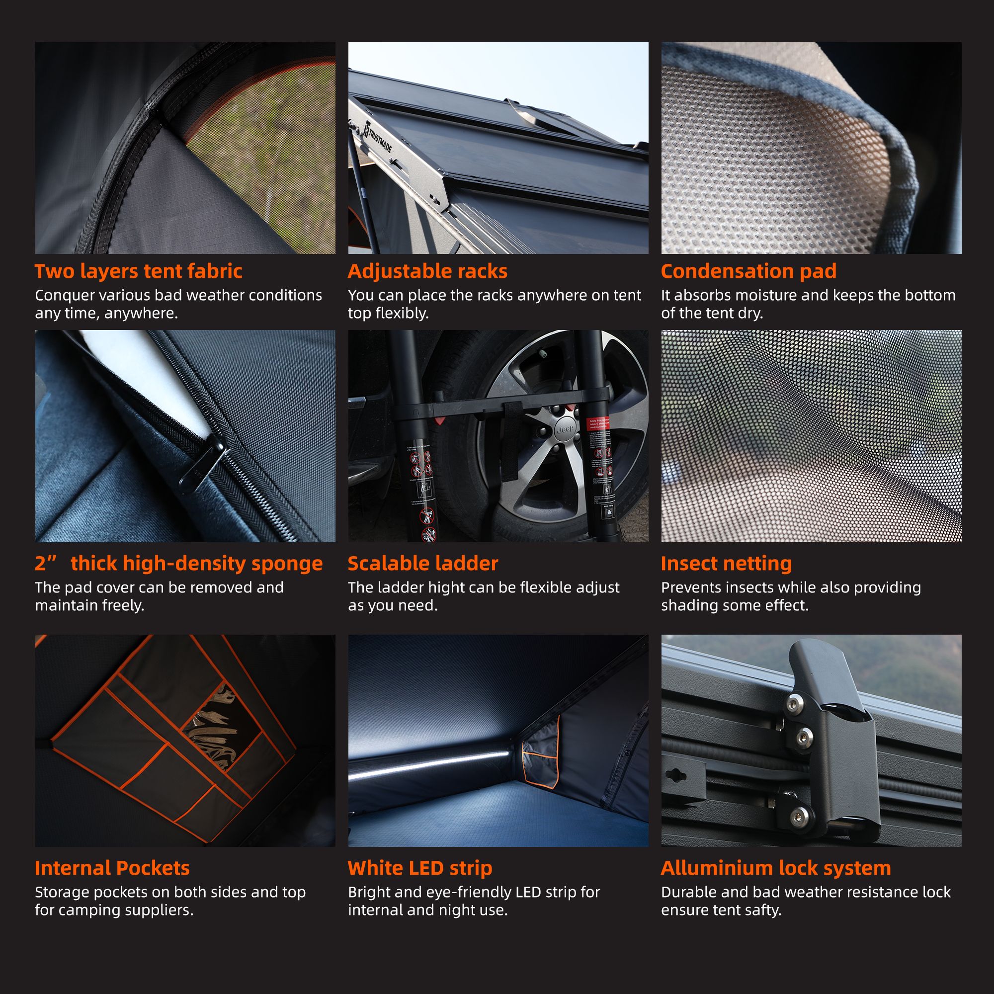 Equipped with customize designed Cargo Cross bars which could fit on all of Trustmade Scout Series Roof Top Tent.