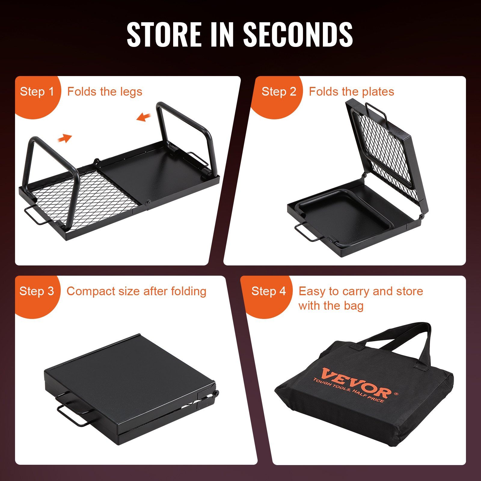 Grill with VEVOR's Campfire Grill Grate The camp grill grate is the ultimate solution for camping enthusiasts looking to cook a decent meal over an open fire. It can make delicious grilled meats and roasted vegetables. Outdoor activities do not need to carry a tripod. It is the first choice for outdoor camping, picnics, and campfires. The camping grate is made of high-hardness steel with super wear resistance, durability, and reliable performance. You can choose different cooking methods for other ingredients with half grill and half griddle. So enjoy your cooking time with fun. A portable outdoor folding campfire grill can be installed without any effort. Super easy to set up and use. The campfire grate is designed for outdoor cookware, frying pans, skillets, and pots, for outdoor cooking over an open fire, camping, bbq, picnic, backpacking, and hiking.