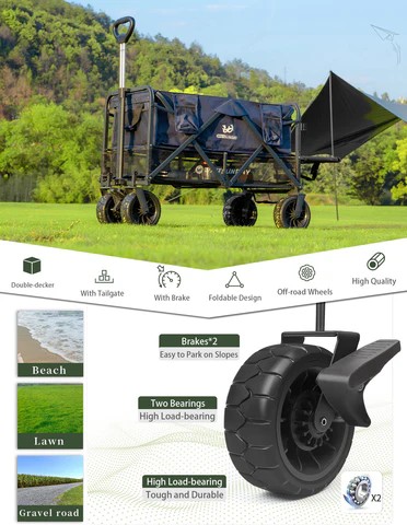 • All-Terrain Large Wheels: Our camping wagon is equipped with 7" x 4" all-terrain wheels that rotate 360°, ensuring smooth movement on various surfaces, including rugged trails, beaches, and uneven terrains. The rear wheels are equipped with two brakes, providing stability when parked on slopes and ensuring your safety.
