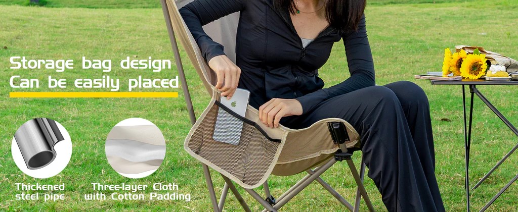 • Side Pocket: Our portable folding chair is designed with a convenient side pocket, allowing you to store books and other larger items for easy access. Enhance your outdoor experience with practicality and comfort.