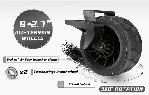 • HAULING POWER - Internal dimensions 34"(L) X 18"(W) X 12"(H) over 4.5 cubic feet of storage space plus space on the tailgate. All four wheels include bearings for smooth and easy of operation. Two Front wheels each includes a pair of front foot brake. LOAD