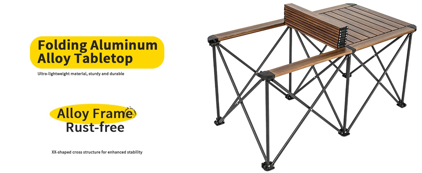 • Sturdy and Durable Construction: Utilizing high-strength aluminum alloy material, the table ensures robust stability and durability, capable of withstanding various outdoor conditions. Whether on grassy fields, sandy beaches, or mountainous terrains, it reliably supports your utensils and food items.