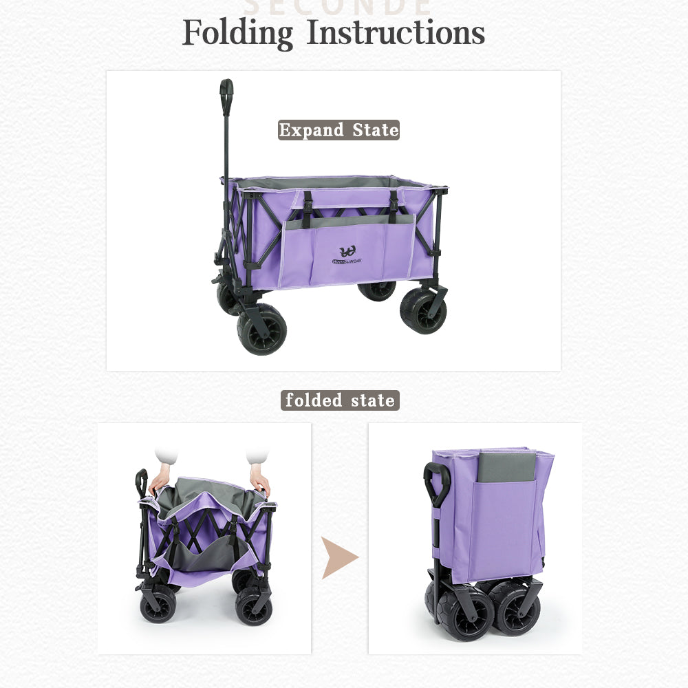 Easy to fold and unfold - Folding and unfolding only take seconds with just a push or pull. The wagon is also able to stand upright even when folded.