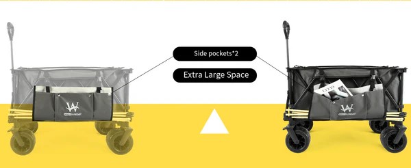 Huge Side Pockets: Offering extra storage space, the sports wagon collapsible features huge side pockets, allowing you to keep water bottles, snacks, and other items conveniently at hand while on the move, catering to various usage needs.