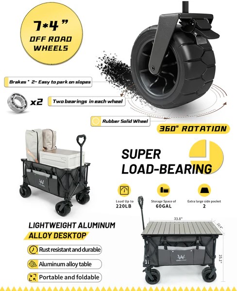 Dual-bearing Wheel: Dual-bearing Wheels for sand allowing for smooth rolling on muddy terrain, grassy areas, and beaches. Even when children are seated in the collapsible wagon, they won't feel the bumps. It is also convenient for transporting pets.