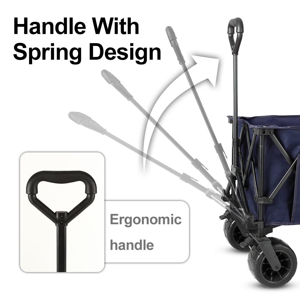 Spring loaded pull handle: Beach wagon cart has spring loaded pull handle always keeping the handle upright no need to bend down to pick up handle.