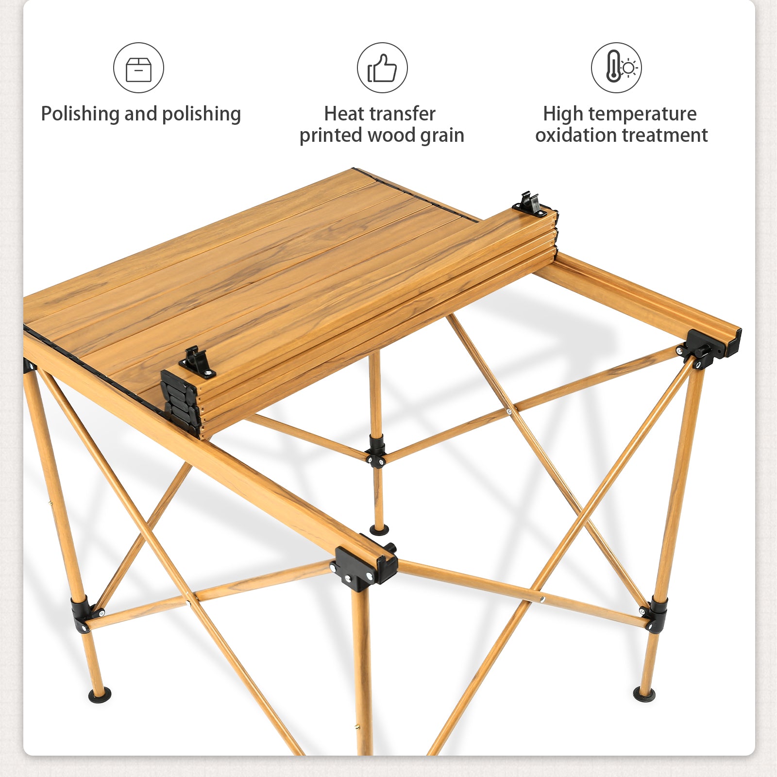• Sturdy and Durable Construction: Utilizing high-strength aluminum alloy material, the table ensures robust stability and durability, capable of withstanding various outdoor conditions. Whether on grassy fields, sandy beaches, or mountainous terrains, it reliably supports your utensils and food items.