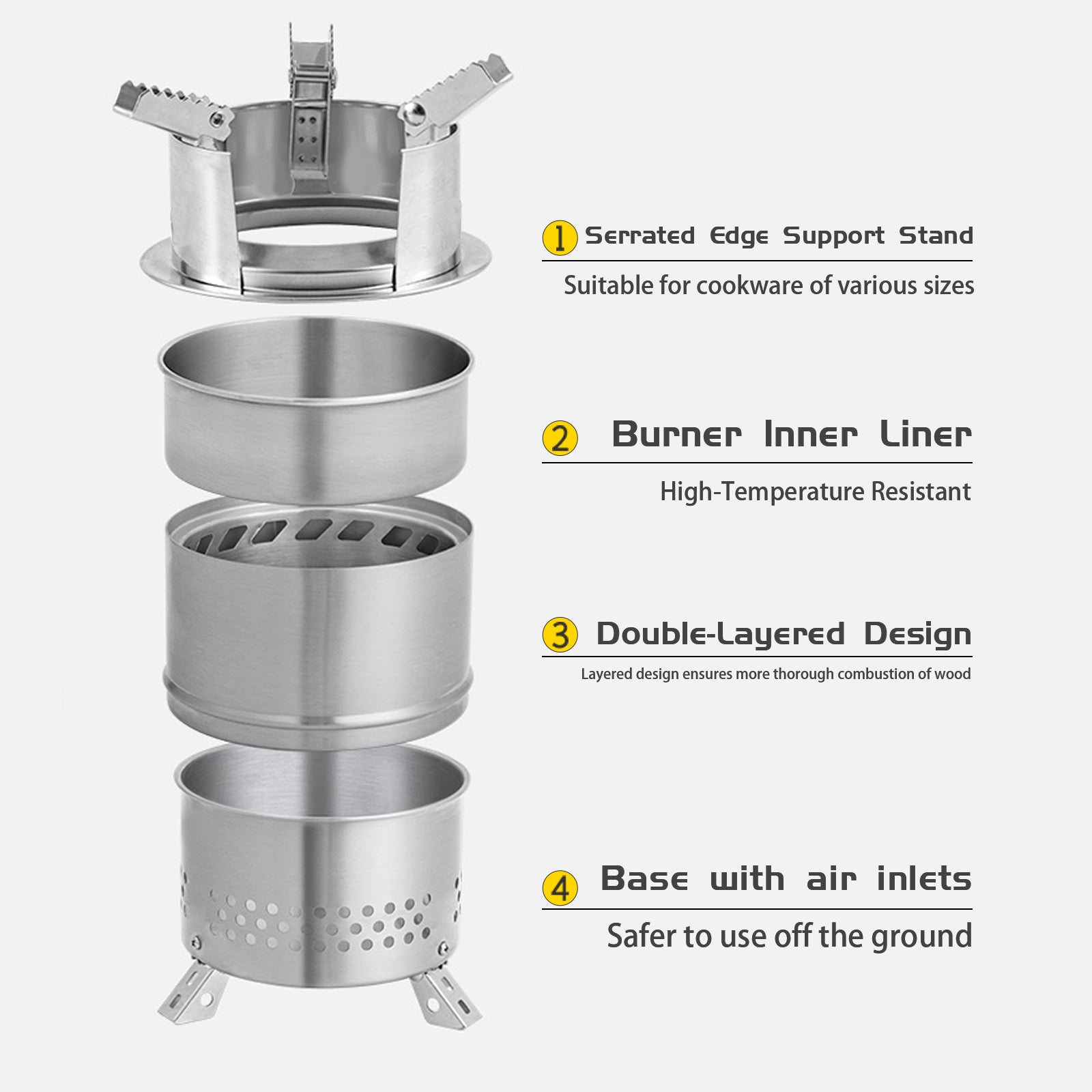 Sturdy and Stable - This camping stove is made of durable stainless steel, capable of long-term use even under heavy loads or high temperatures. The portable wood stove features an anti-slip gear design on the top of the stand, ensuring safer and more secure placement of camping pots, reducing the risk of slipping.